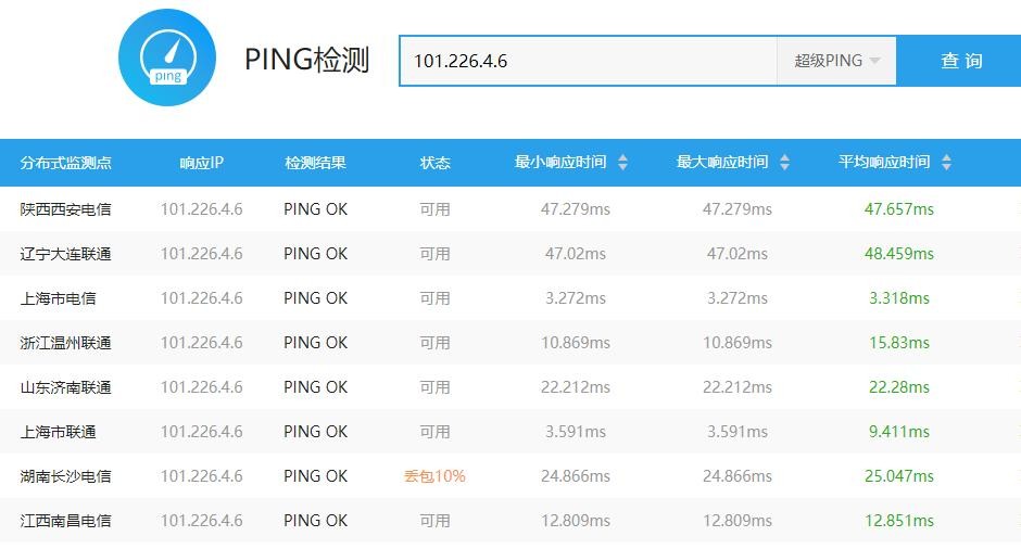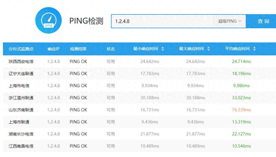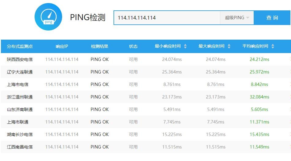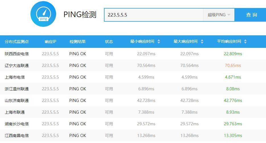本人在在头条号里根据我家移动网速利用国内免费的公共DNS服务器去ping百度、淘宝和腾讯网写了一篇《国内公共DNS哪家网速快,实网测试来了》,有很多朋友留言说“没有参考价值,只能代表你们小区的移动用户”和“直接ping的网站而非dns地址”。今天我在借助爱站网的ping检测直接对国内免费公共DNS服务器地址检测,不进行网络运营商提供的DNS服务器。下面我们来看看它们的速度如何。