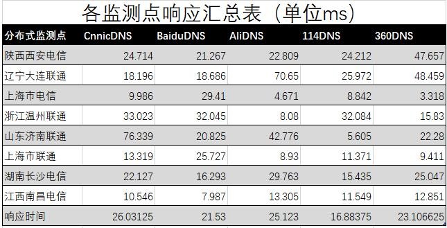 下面我们看看各DNS平均响应汇总表