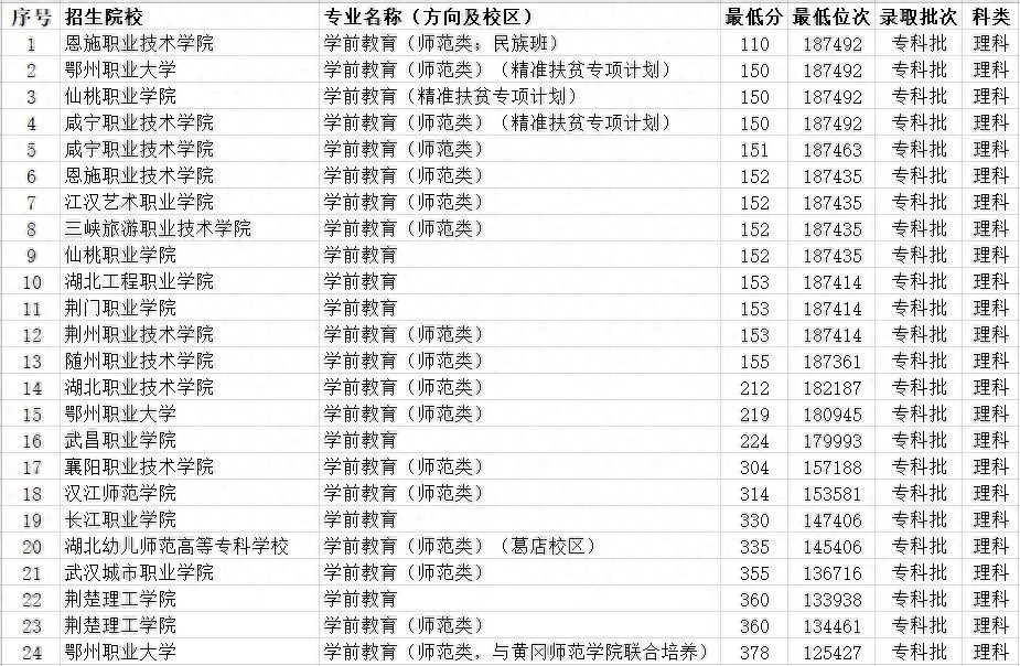 湖北学前教育专业专科学校排名(2019年湖北省理科最低录取分数线)