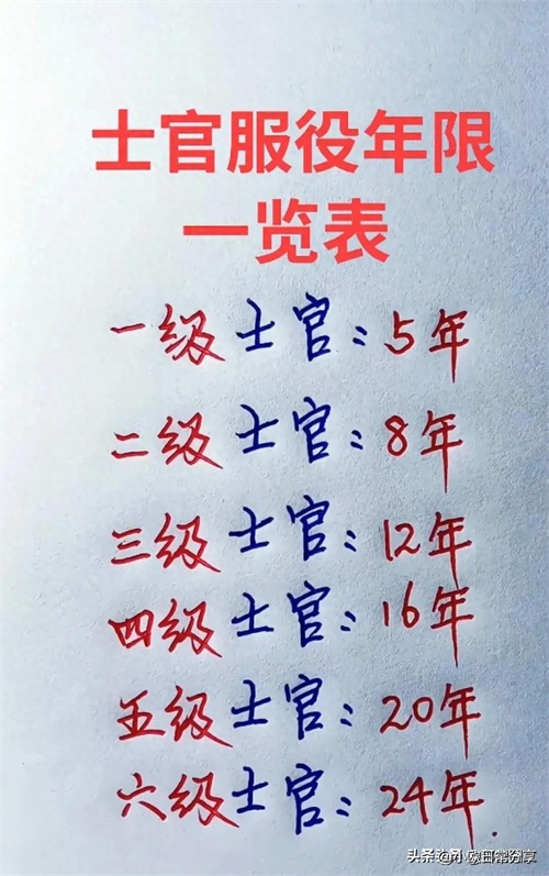 士官服役年限一览表,六级士官24年。
