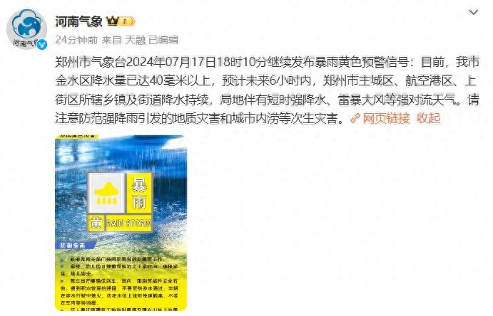 郑州市气象台2024年07月17日18时10分继续发布暴雨黄色预警信号:目前,郑州市金水区降水量已达40毫米以上,预计未来6小时内,郑州市主城区、航空港区、上街区所辖乡镇及街道降水持续,局地伴有短时强降水、雷暴大风等强对流天气。请注意防范强降雨引发的地质灾害和城市内涝等次生灾害。