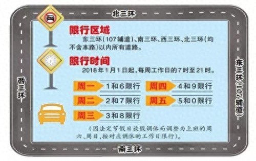据了解,限行区域为:东三环(107辅道)、南三环、西三环、北三环(均不含本路)以内所有道路。限行规定,号牌最后一位阿拉伯数字为1和6的机动车周一限行、2和7的周二限行、3和8的周三限行、4和9的周四限行、5和0的周五限行(因法定节假日放假调休而调整为上班的周六、周日,按对应调休的工作日限行),外地车牌和临时车牌也需要遵守限行规定,悬挂新能源汽车专用号牌的新能源汽车不限行。闯限行,扣三分罚100元,一天可以处罚多次。