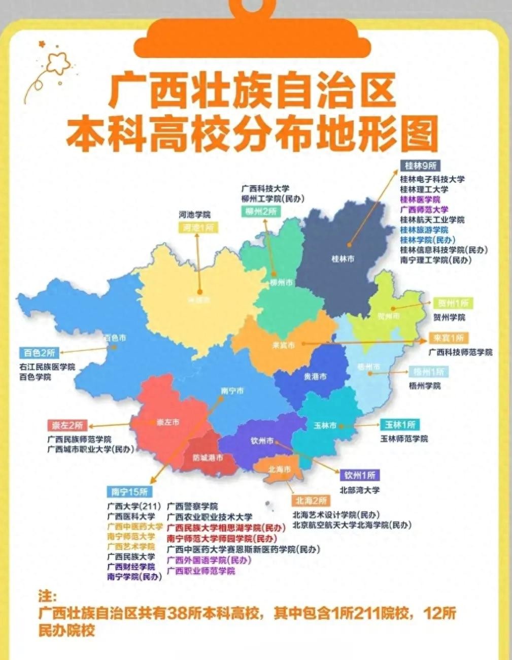 广西给力的地方在于百色都设立了两所公办院校,和老区的地位很是匹配,而北海、防城港两个地市连一所公办本科都没用,有些可怜。