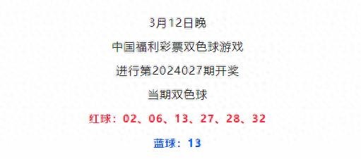 近日,中国福利彩票双色球游戏进行第2024027期开奖。当期双色球红球:02、06、13、27、28、32 蓝球:13。