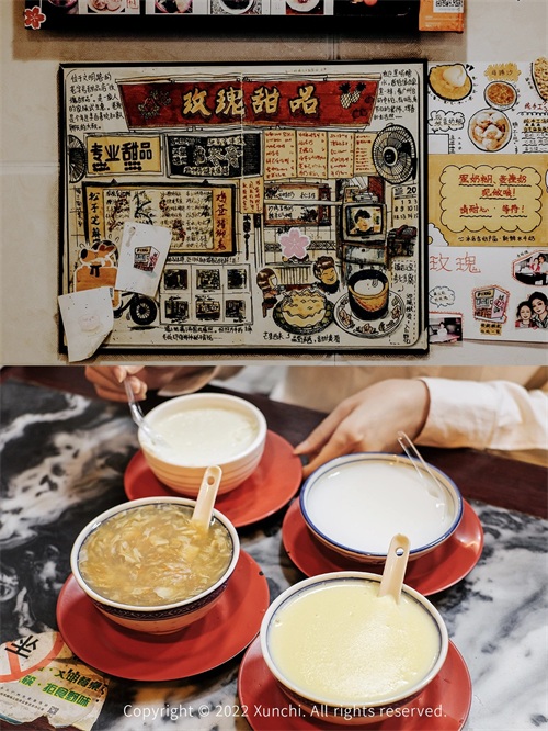 2、玫瑰甜品:已经开了二十余年的玫瑰是附近街坊紧心水的手工糖水铺,温热香软的招牌杏仁豆腐连蔡澜都专程从香港跑来吃,另外两道奶制品双皮奶和凤凰奶糊都是用的羊奶,奶香中又带有丢丢羊膻味还算可以接受。