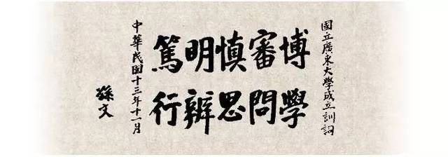 1924年,孙中山亲手将广州地区多所高校整合创立国立广东大学。1926年定名为国立中山大学。如今该校由1952年院系调整后分设的中山大学和中山医科大学于2001年10月合并而成。中山大学校训为孙中山先生于1924 年11月11日在国立广东大学举行成立典礼时亲笔题写,校训词为“博学 审问 慎思 明辨 笃行”。