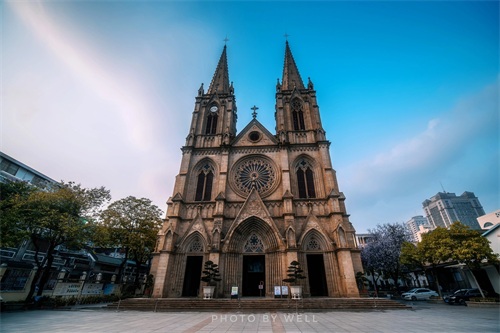 石室圣心大教堂位于广州市一德路,有一百六十年的历史。教堂外观华美典雅,正面是典型的左右及上下三段式立面,两端耸立着两座尖顶石塔,底层开设有三个尖顶劵门,中央劵门上面有一个巨大的圆形镂空玫瑰窗。整座建筑由外到内都散发着哥特风格成熟时期的特点。由于石室圣心大教堂设计精美,人们喜欢称其为“东方巴黎圣母院”,但实际上巴黎圣母院为平顶双塔,石室圣心大教堂为尖顶双塔,外观上明显不同。