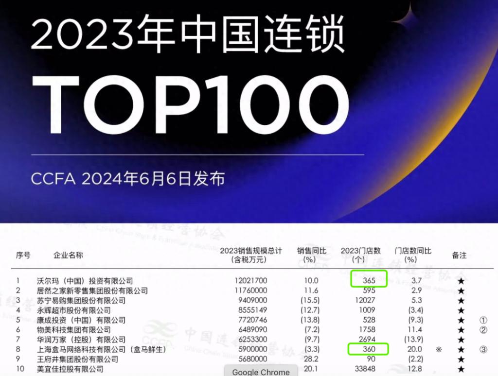 中国连锁经营协会 ( CCFA ) 最新《2025 年中国连锁 Top100》里,沃尔玛 ( 中国 ) 以 365 家门店,1202.17 亿元年销售额位居首位,位居榜单第八的盒马是 360 家门店,年销 590 亿。