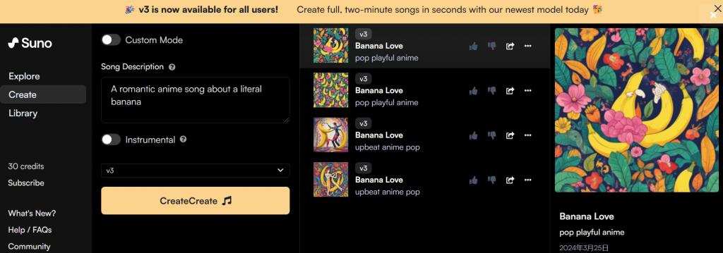 产品信息:Suno V3 是人工智能初创公司 Suno 推出的 " 广播级 " 音乐生成模型,旨在为用户提供更加丰富和高质量的音乐体验。该模型能在数秒内根据内容主题、音乐风格等提示词生成 2 分钟的完整音乐。
