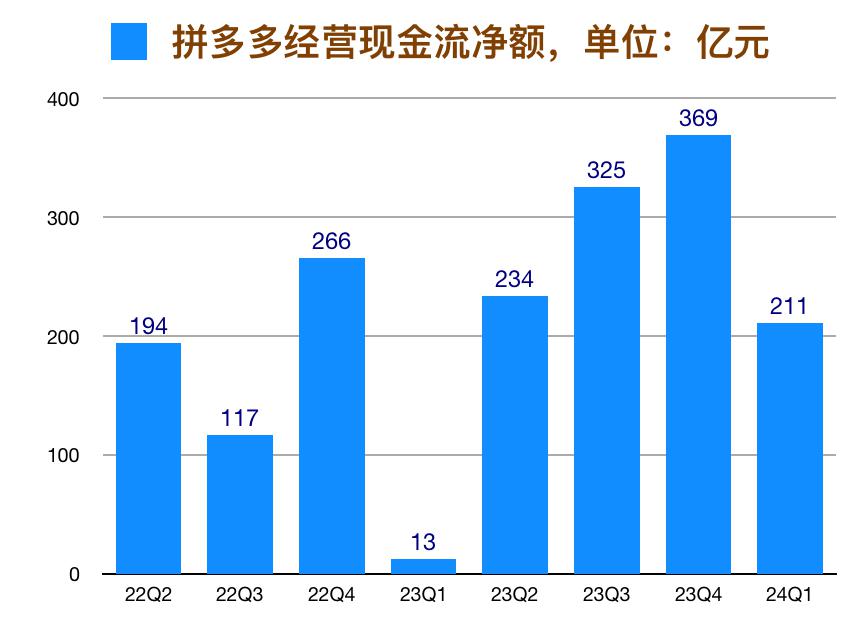 这项收益的同比增长很快,说明拼多多产生了大量的经营现金流,花不完又没有投资去向的就放着吃利息。从下面的经营现金流图表里可以看出它每个季度强大的现金增加能力。相对而言,来自政策补贴的其他收入在每个季度波动较大。
