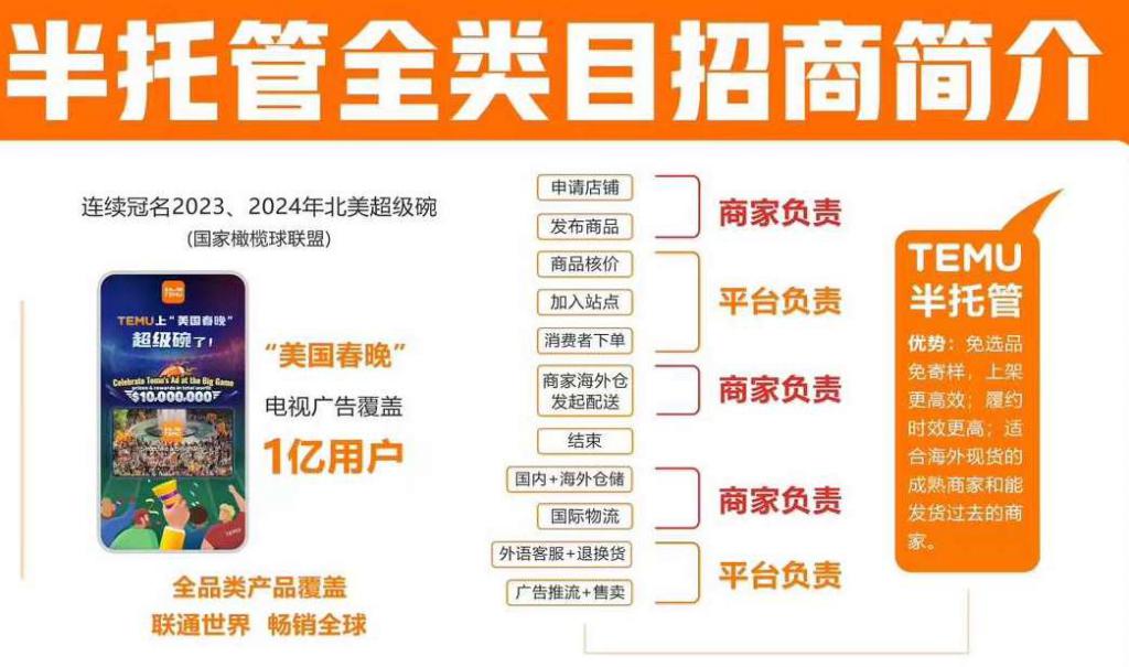 据了解,目前拼多多正在尝试另一种半托管模式,主要面向那些在欧美当地市场有现货,或者有发货能力的更高一级商家,他们与产业带工厂实际上是两类不同的群体。这个项目正在深圳前海运作招商,从朋友圈传出的一张招商图看出,半托管模式的履约实效更高,不用给平台寄送样品,适合海外现货和能发货过去的商家。如果是从国内发货,商家要自己承担国内 + 海外仓储,以及国际物流。这相当于平台把跨境物流交给商家负责,绕开了最繁琐麻烦的环节。