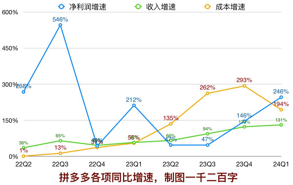 从上图不难看出,拼多多各季度的净利润同比增速犹如锯齿形波动,相比于收入增速的递增,没有什么规律可言。这里选取的是截至 2024Q1 之前连续 8 个季度的财报业绩,再之前的净利润同比增速是负值,被剔除。
