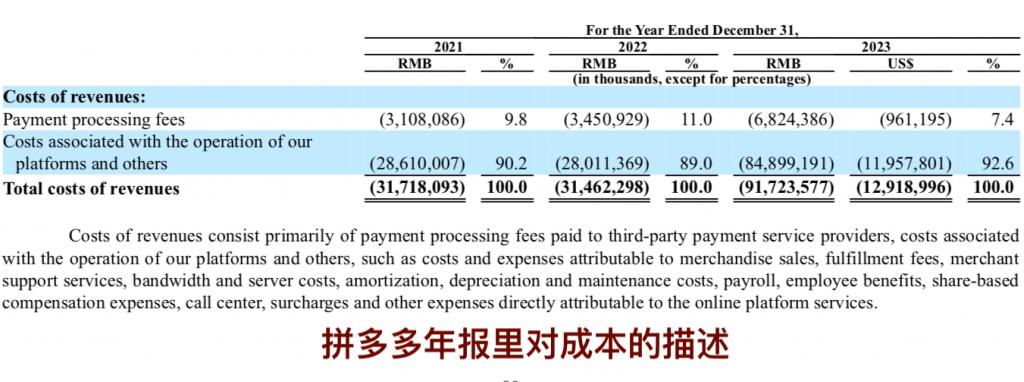 为什么会出现成本与收入变动之间的 " 偏差 " 呢?这里先要了解拼多多的成本项包括什么。根据其最新年报,成本里单列出支付处理费用,也就是给微信、支付宝、银联等第三方的交易手续费,这项与订单量和金额同进同出,也可以大致理解为手续费与收入同比例变动;此外还包括涉及平台运营的商品销售、物流履约费用、商家服务支出、带宽与服务器、资产折旧摊销、平台运营人员的报酬,以及客服中心支出等。