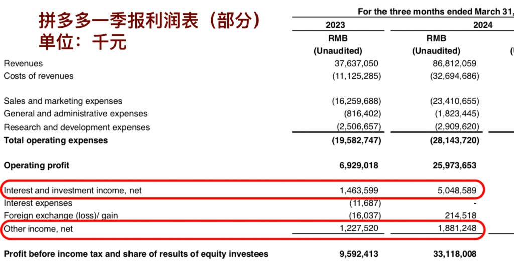 除成本外,还有两项——利息及投资收益净额,以及其他收入,对拼多多净利润影响较大。利息及投资收益主要是定期 / 活期存款和债券的利息,而其他收入涉及政策补贴、返税等。以最新发布的一季报为例,24Q1 季度利息及投资收益净额为 50.5 亿元,单这一项入账就覆盖掉了公司行政管理和研发这两项支出 47.3 亿元。换句话说,拼多多一个季度存银行的利息就能拿来给行政、管理、研发人员开工资了。