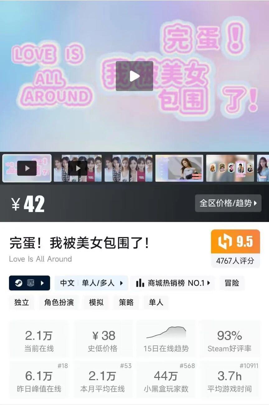 自 10 月末上线后,《完蛋!我被美女包围了!》就迅速登上了 Steam 国区畅销榜首。只要花 42 元就能和六大性格各异的真人美女谈恋爱,做一回 " 赛博韦小宝 ",因此很快吸引了大量的男性玩家。