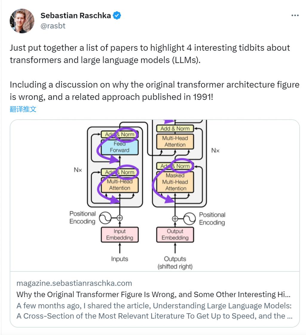 随后,Sebastian 在 Ahead of AI 发布文章专门讲述了为什么最初的 Transformer 构架图与代码不一致,并引用了多篇论文简要说明了 Transformer 的发展变化。