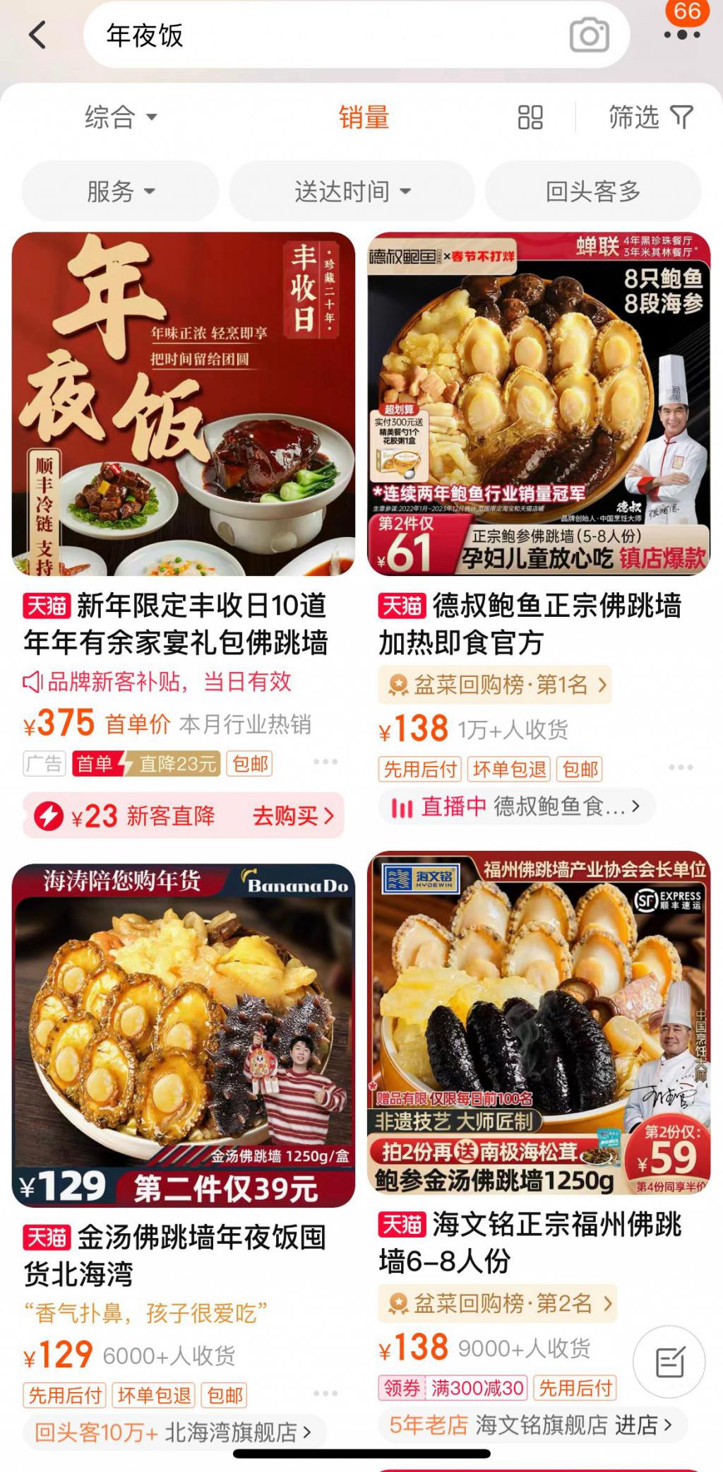 记者在淘宝以 " 年夜饭 " 为关键词进行搜索,销量靠前的大多是佛跳墙预制菜。如德叔鲍鱼佛跳墙年夜饭大盆菜,已售出超过 1 万份,数据显示,该菜品一周内长沙市有超 100 人购买。海文铭正宗福州佛跳墙年夜饭已售出超过 9000 份。