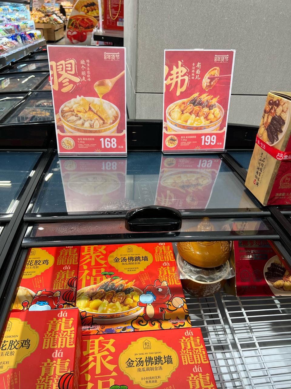 2 月 1 日,在盒马高升广场店,记者看到,各种盒马自有品牌的年夜饭预制菜已经成为当下的主推产品。168 元的鲍鱼花胶鸡,含有 6 只鲍鱼,200 克花胶,一只整鸡。199 元的金汤佛跳墙,含有海参、鲍鱼、花胶以及虾等多种海鲜。这些预制菜都以红色礼盒包装,送人还可以帮忙打上红色丝带。