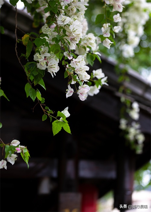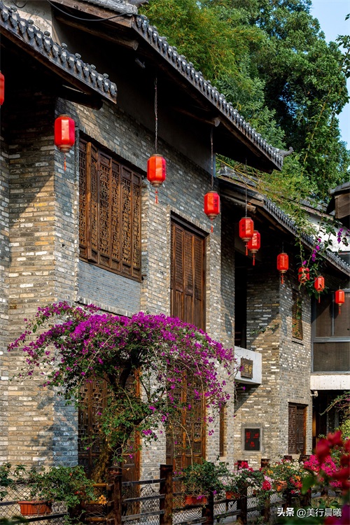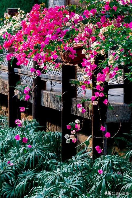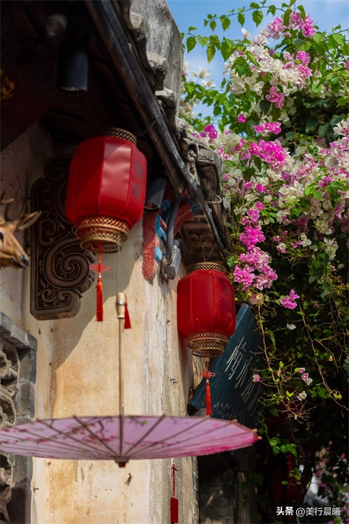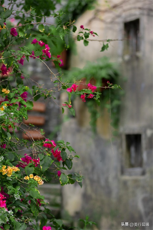 甘坑古镇也能看到古风满满的三角梅,古镇的三角梅面积不算特别大,但河岸边、巷子里、甚至屋顶上,都开满了各种各样的三角梅,每一次的相遇都充满了惊喜。