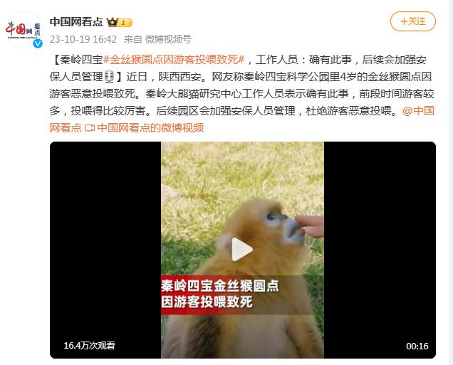 10 月 18 日,有网友发布微博称,日前秦岭四宝科学公园的 4 岁金丝猴 " 圆点 " 因游客恶意投喂导致肠胃不适,经救治无效,于 17 日夜里死亡。据中国网看点微博 19 日报道,秦岭大熊猫研究中心工作人员表示确有此事,前段时间游客较多,投喂得比较厉害。后续园区会加强安保人员管理,杜绝游客恶意投喂。