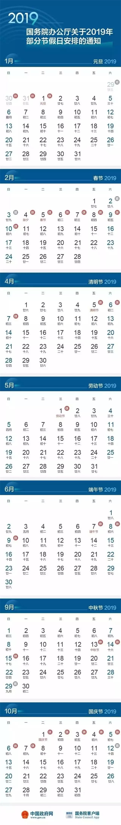 权威发布!2019年节假日安排来了!