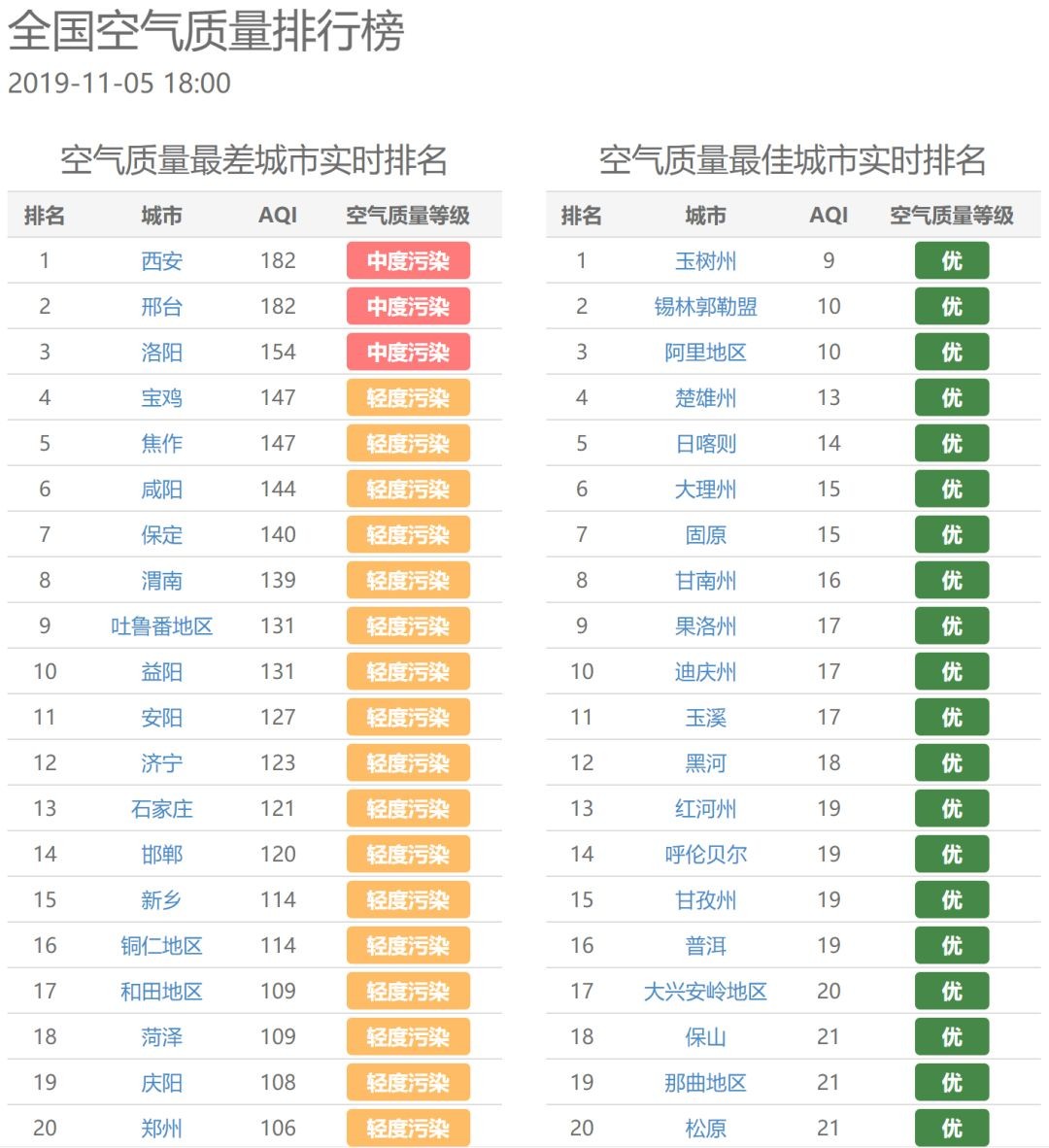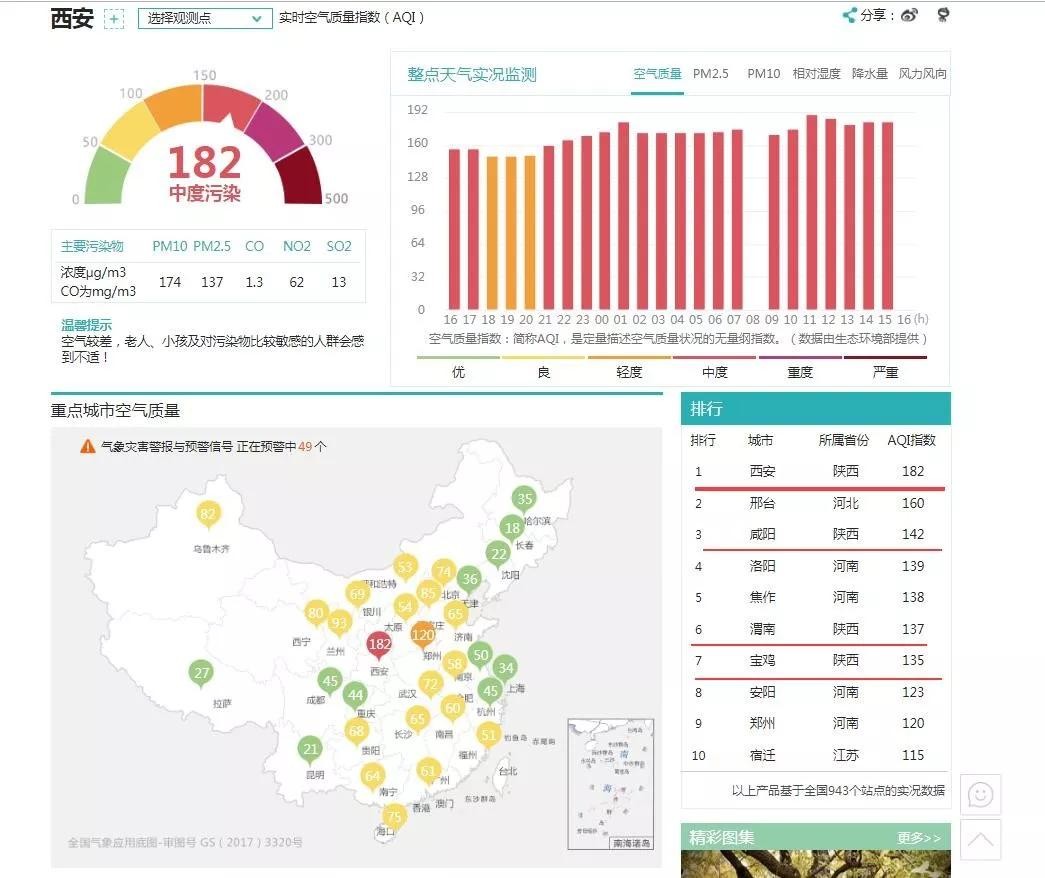 全国空气质量最差城市实时排名,西安排第一