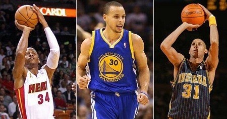 作为NBA历史上最伟大的三分射手之一,雷-阿伦依然保持着职业生涯的三分球命中数纪录——2973个。排在历史第二位的是雷吉-米勒(2560个)。金州勇士队的斯蒂芬-库里目前以1593个三分球暂列历史第19位。