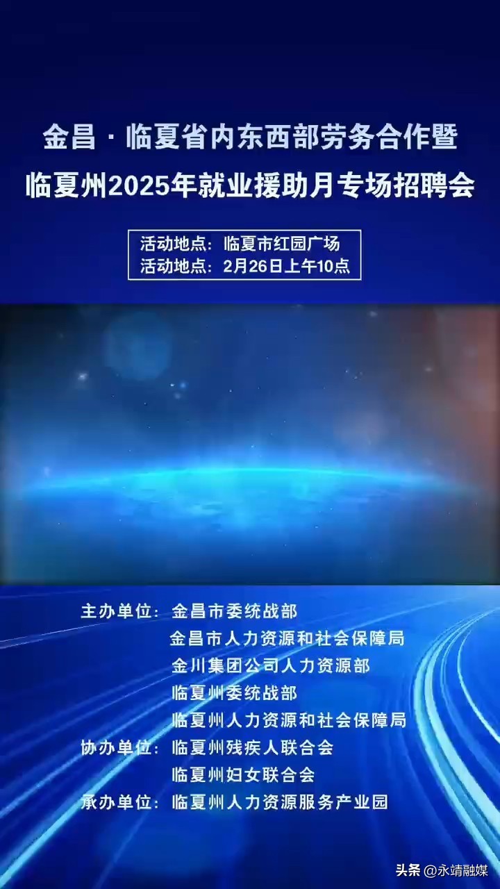 为认真落实《金昌市金川集团公司与临夏州深化交流合作框架协议》,建立两地劳务合作关系,深化两地劳务就业协作,2月26日上午10点,金昌市委统战部、金昌市人社局、金川集团公司人力资源部联合临夏州委统战部、临夏州人社局共同组织金昌市各类企业60多家1000余个岗位,在临夏州临夏市红园广场开展专项招聘活动。现将金昌部分参会企业名录公布如下,诚邀广大求职者届时参加!