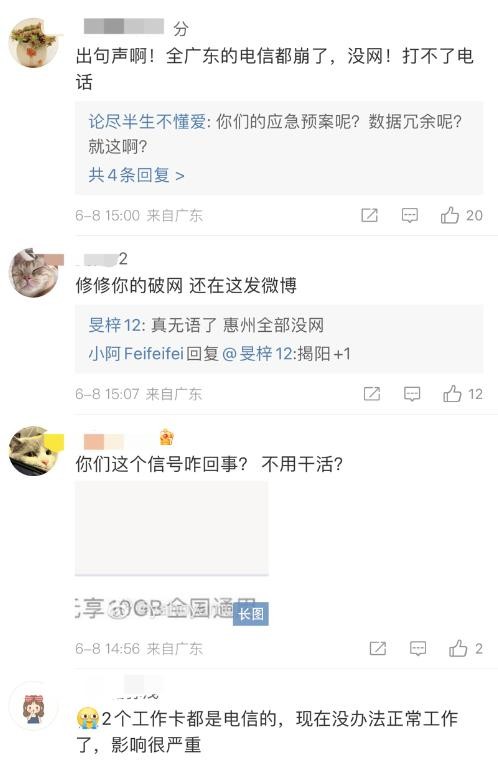 另外,有网友晒出“特别重大网络故障”的截图,内容显示6月8日14:15开始,全省中电信移动电话互拨打提示空号,故障原因待核实中。