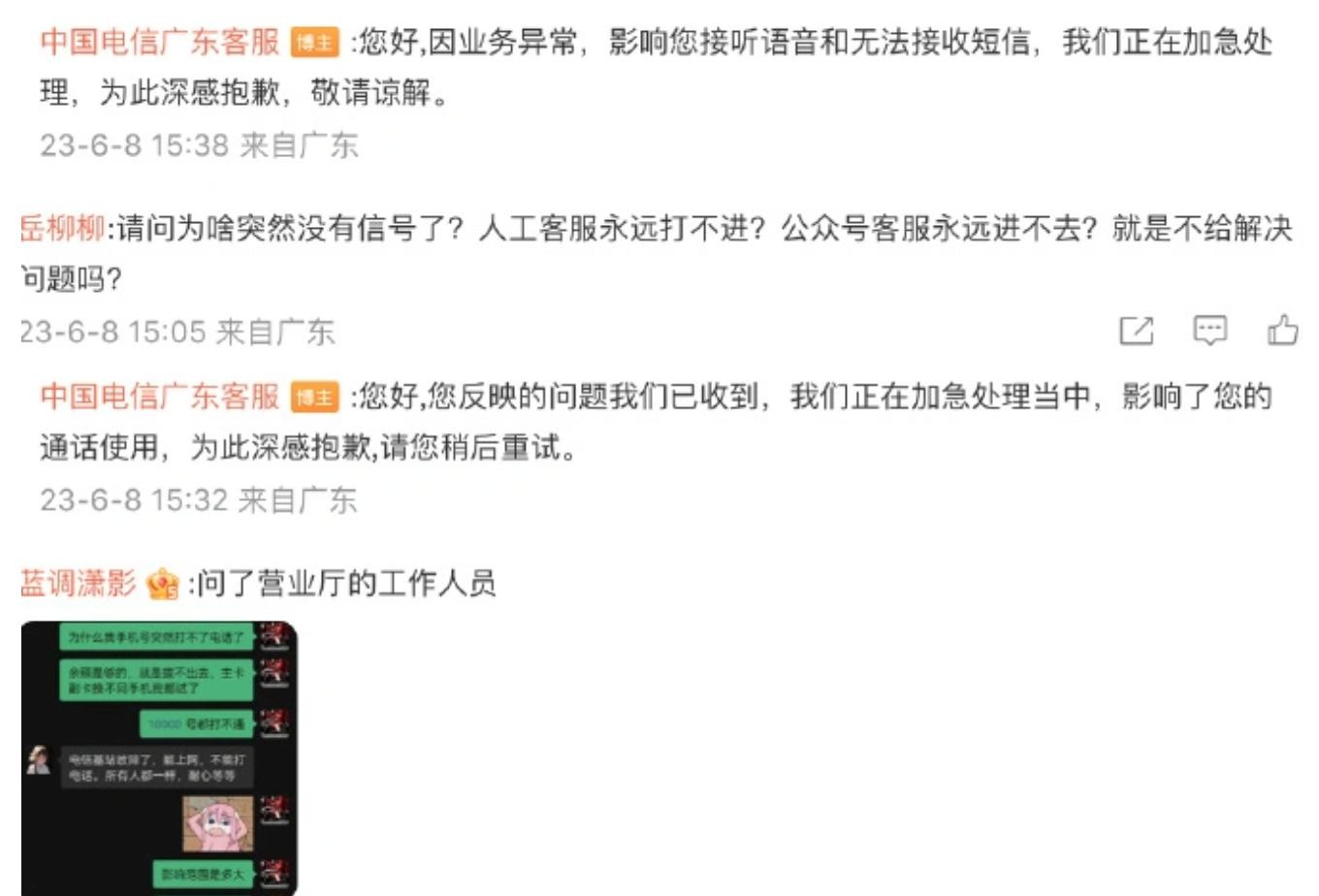 @中国电信广东客服 回应网友称:因业务异常,影响接听语音和无法接收短信,我们正在加急处理,为此深感抱歉,敬请谅解。