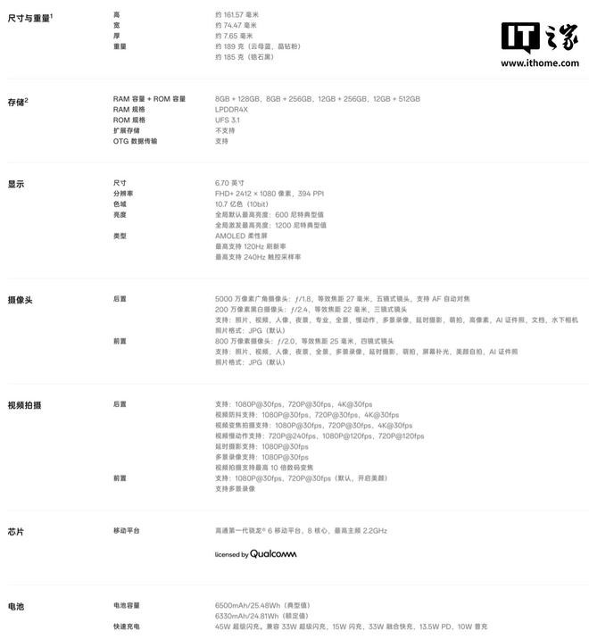 规格方面,该机使用骁龙6 Gen 1处理器,搭载LPDDR4X RAM和 UFS 3.1存储,内置6500mAh电池(支持45W超级闪充),支持 NFC。
