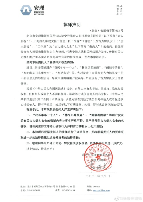 新京报讯 2月1日,娜扎工作室发布律师声明,针对近日部分网络用户在社交媒体上发表大量关于古力娜扎的不实信息及侮辱性言论,已经严重侵犯了其名誉权。请相关主体立即停止侵权行为,并向古力娜扎公开道歉。