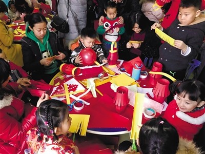 为了传承中国节日文化精髓,让儿时熟悉的年味再次呈现,近日,东胜区第二幼儿园中班组的老师们策划了以“做中国人,过中国节,传中国情,圆中国梦”为主题的大型新年活动,让孩子和家长们在活动中了解元旦节日文化,体验浓浓的“年”味儿,传递爱的温暖。图为孩子们制作红灯笼。