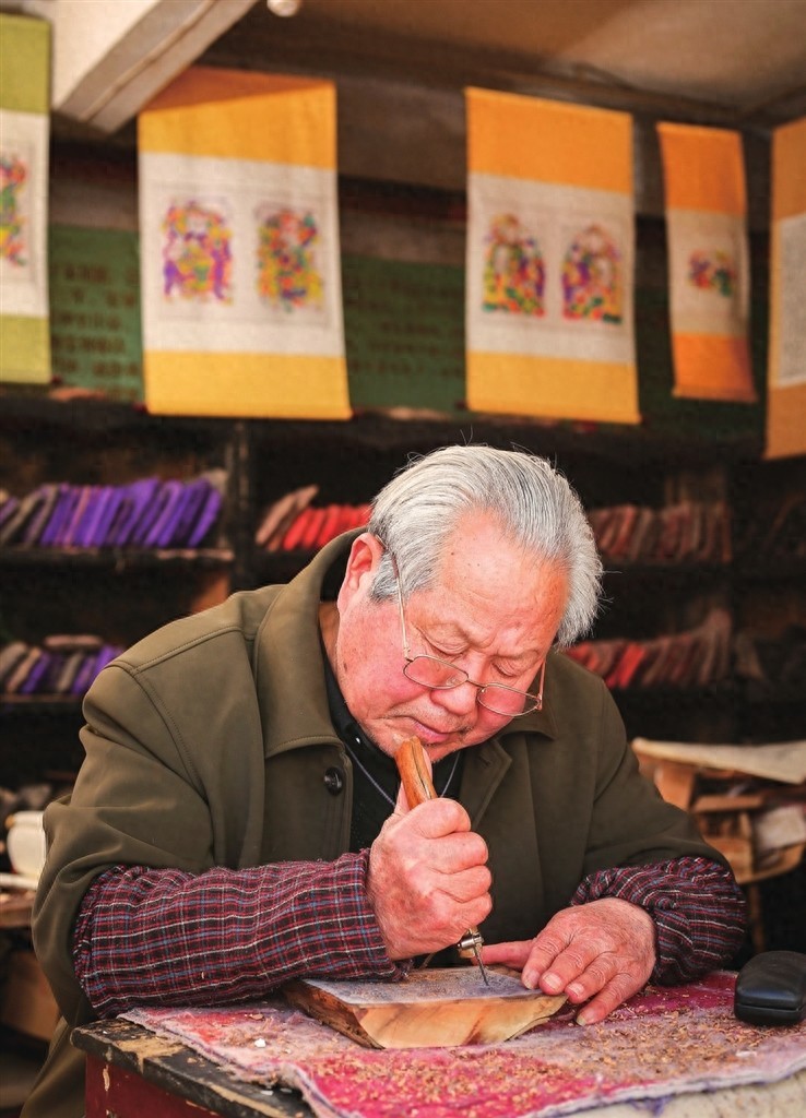 朱仙镇木版年画“万同老字号”第四代传人张连生正在雕刻