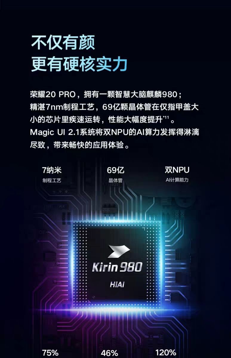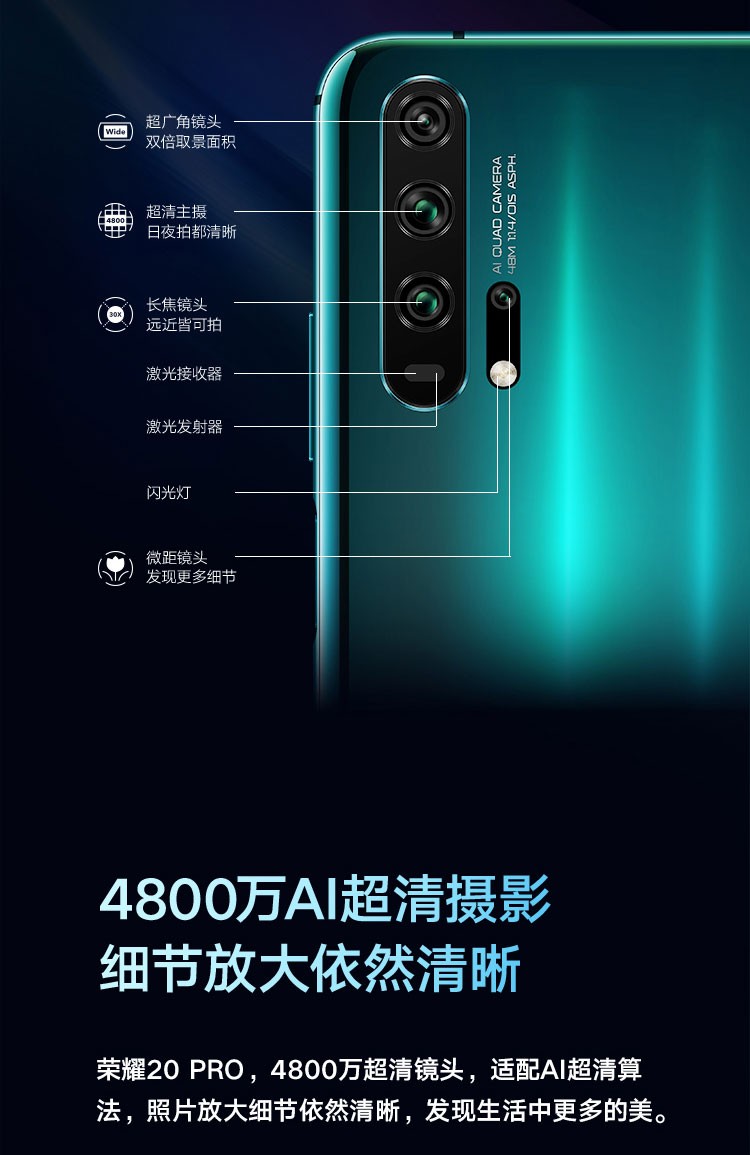 荣耀20PRO采用了4000mah的大电池,配合22.5W超级快充,给我们带来强劲续航的同时,也能快速回电。全系8GB的超大运存,128G/256G的超大内存,手机性能尽情发挥,配合石墨烯散热,游戏流畅体验无压力。