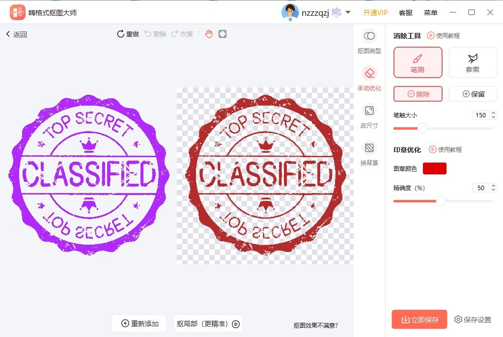 第三步,图片上传后软件开始处理抠出印章,完成抠图后在界面中可以预览到效果图。