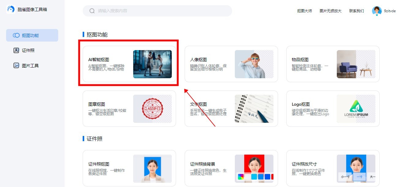 第一步,搜索『酷雀图像软件箱』官网,打开网站后在首页中选择【AI智能抠图】功能。