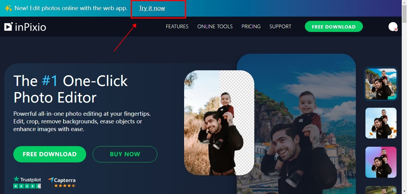第一步,搜索『inPixio』官网,打开网站后在首页中点击【Try it now】链接,跳转到新页面。