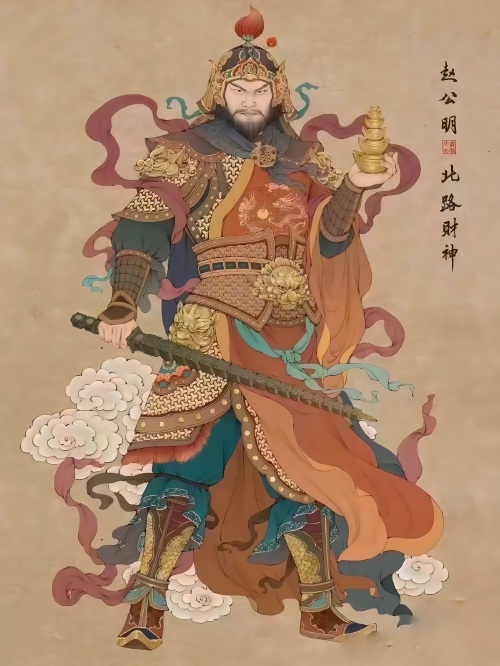 北路财神赵公明是一位秦朝的将军,也是中国民间信仰的重要财神之一。赵公明以勇猛、力量和独立性著称,他曾经在战争中立下赫赫战功。由于他的形象被广泛地崇拜和信仰,人们也把他视为财富的守护神,希望通过供奉赵公明来保佑自己和家庭的财富安全。