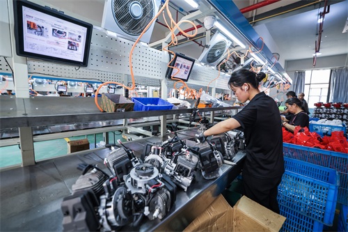 2024年8月14日,在浙江省金华市金东区曹宅镇的浙江托马斯工具制造有限公司数字化车间内,工人在流水线上生产出口的园林机械。近年来,金华市金东区大力推动数字化改造,聚焦智能家居、电动(园林)工具等主导行业,以场景应用带动“智改数转网联”项目建设。新华社记者 徐昱 摄