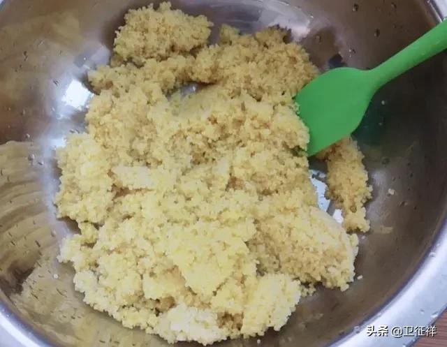 第一步:小米提前浸泡一个小时,然后清洗两遍,洗干净之后倒入没过小米5毫米的水,放到蒸锅中蒸20分钟,把小米蒸熟,蒸熟的小米取出来,倒到大碗里搅散,将其晾凉备用。