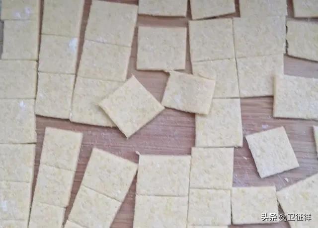 第三步:案板上撒些干面粉,把面团分成两份,揉一揉,团圆按扁,用擀面杖擀成约1毫米厚的大薄片,擀好之后切掉四周不规则的部分,然后再上面扎上一些小孔,然后用刀切成小块。
