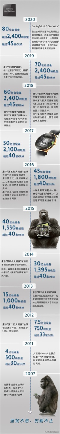 2007年第一代手机康宁大猩猩玻璃被应用;2012年消费电子展会(CES)上,康宁推出了第二代大猩猩玻璃;2013年CES上,康宁推出第三代大猩猩玻璃,具备“原生防损”技术;2014年11月,康宁推出了第四代大猩猩玻璃。实验中从1米高处掉落时,其完好率仍可保持在80%;2016年7月,康宁推出第五代大猩猩玻璃。当屏幕正面朝下从1.6米的高度跌落到粗糙表面,其完好率能达到80%;2018年7月,康宁推出其第六代大猩猩玻璃,试验中1米高度进行15次摔落,保持完好,比大猩猩5要好两倍;2020年7月23日 , 康宁公司推出了其在玻璃技术方面的最新产品: Victus™。