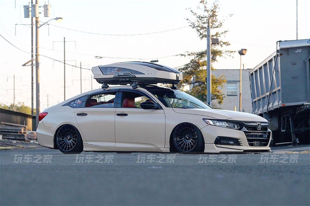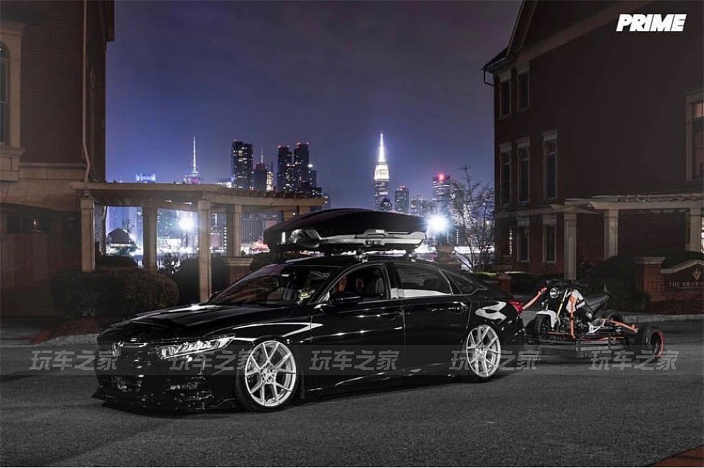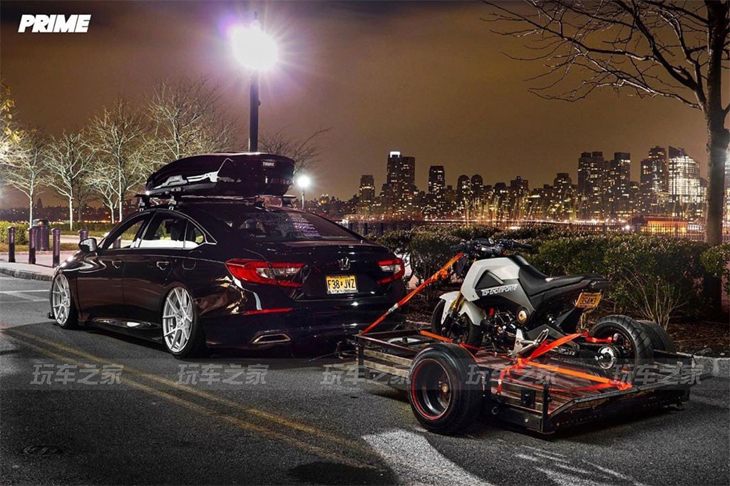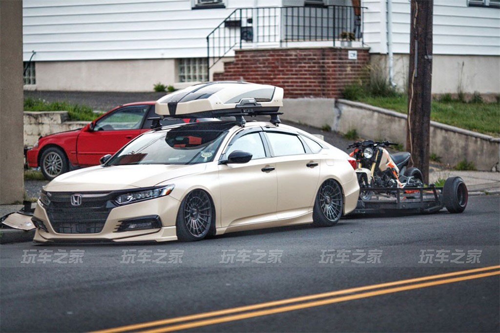 因为自己在玩机车的缘故,车主就想把雅阁和机车结合在一起,就定制了一辆拖车,同时加了一套Thule行李箱,走起了旅行车的改装风格。