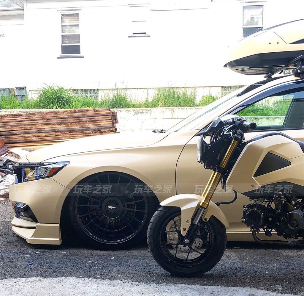 虽然黑化的车很好看,不过车主坦言想找让车子更有自己的特色,就给雅阁和机车一起改了沙漠黄贴膜。