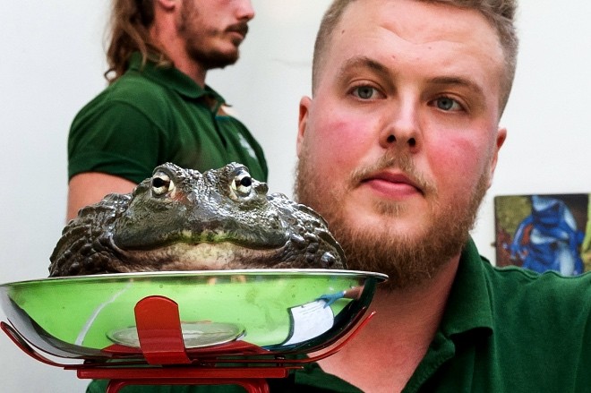 当地时间2019年8月22日,英国伦敦动物园进行年度动物盘点,一只体重达到900克的非洲牛蛙(African Bullfrog)正在称体重。