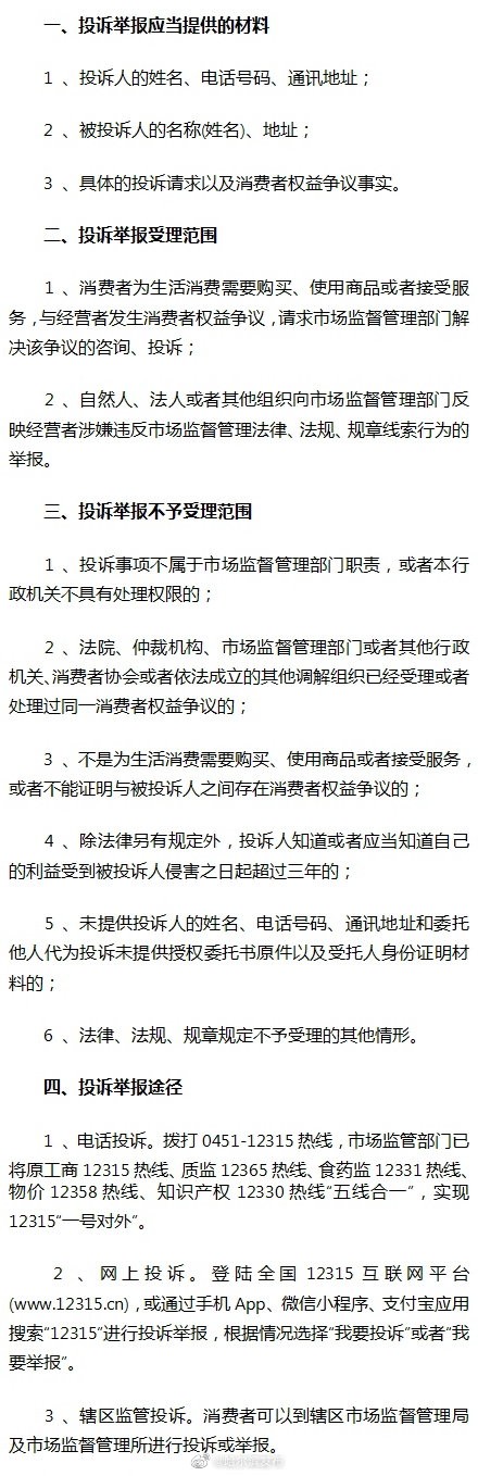 12315投诉举报热线受理范围及途径