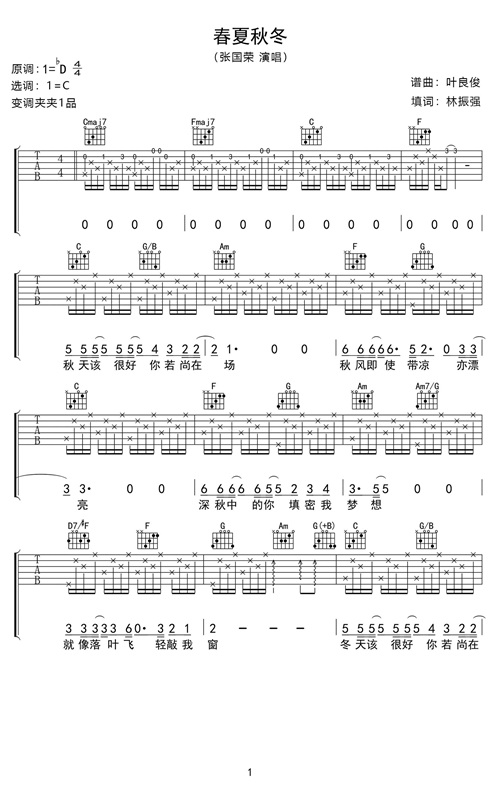各位热爱音乐和吉他的朋友们,可以对照谱子和音频来演奏。原调bD调,本谱选用C调,变调夹需夹1品。以下是张国荣的《春夏秋冬》音频欣赏: