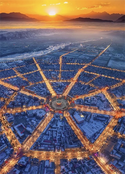 这里曾是古丝绸之路上的一座重镇,现在因旅游业而兴起。整个城市以中心广场为起点,按照太极八卦的形状依次向外扩展,形成了八条主街和六十四条小街的布局,又如同一个巨大的迷宫。