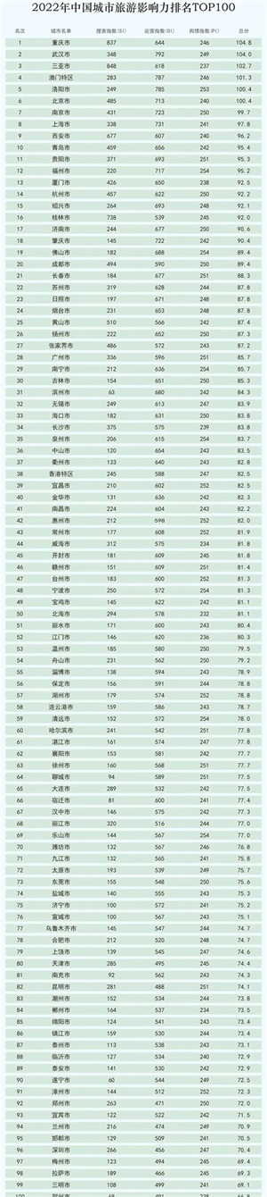 近年来,中国的旅游业蓬勃发展,许多城市都把旅游作为了重要的支柱产业,带来了不小的经济效益。在这个背景下,有一份备受关注的榜单成为了人们热议的话题,那就是2022年中国城市旅游影响力百强城市榜单。这份榜单通过搜索指数、运营指数和舆情指数,对中国100座城市的旅游影响力进行了全面排名,然而,榜单的排名结果引发了一些争议。